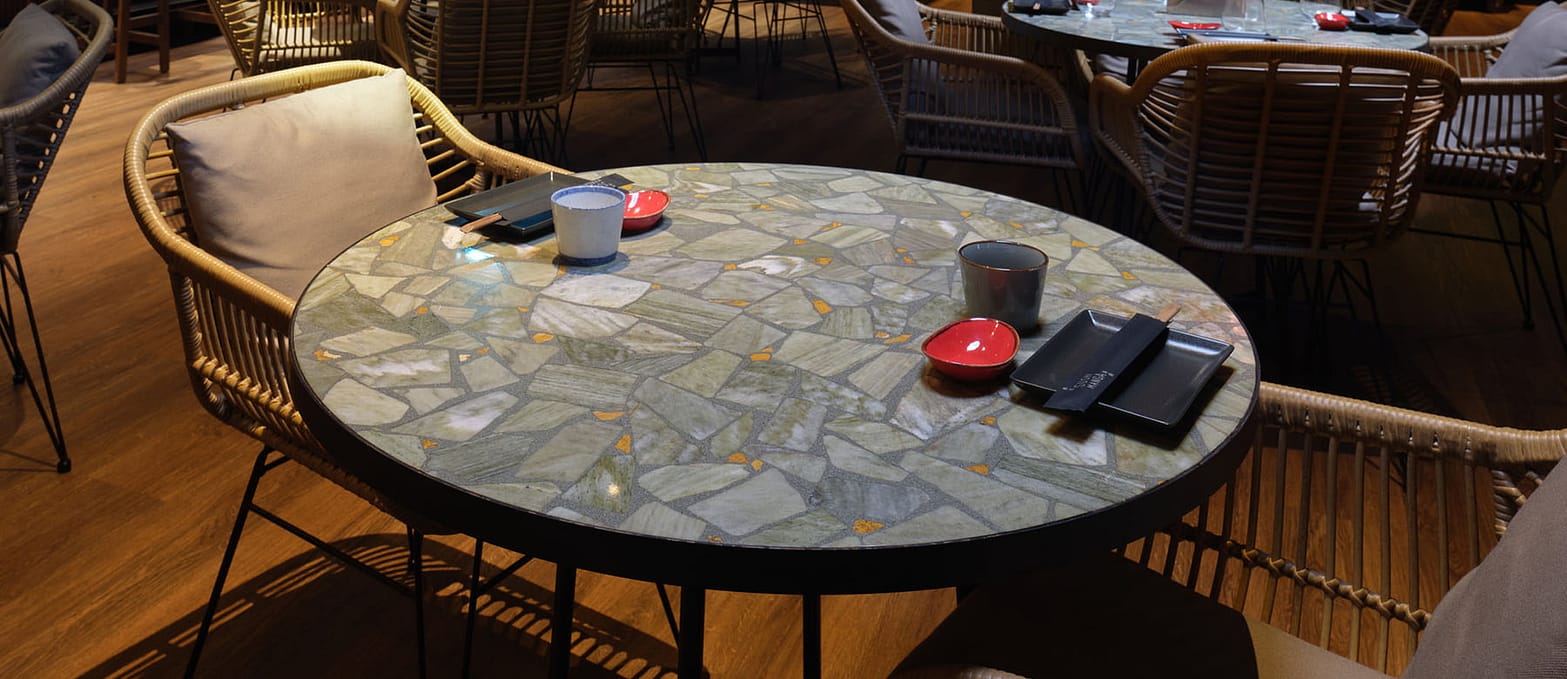 Antre Design tarafından tasarlanan ve Palezzo tasarımcıları tarafından özel olarak üretilen Sushi Manga Restoran masaları ile eşsiz bir yemek deneyimi yaşayın. Showroom'umuzu ziyaret ederek veya web sitemizi inceleyerek diğer tasarımlarımızı keşfedin.